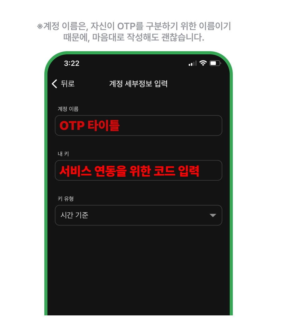 OTP 타이틀과 연동을 위한 코드를 입력해야 합니다.