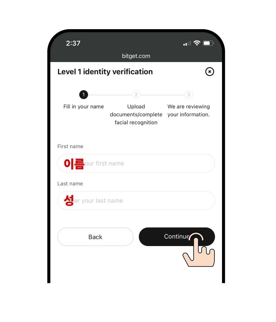 이름과 성을 입력합니다. 이때 신분증과 이름이 꼭 같아야 합니다.