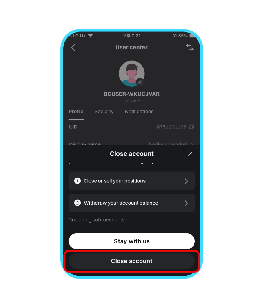 화면을 아래로 스크롤하여 「Close account」를 클릭합니다.