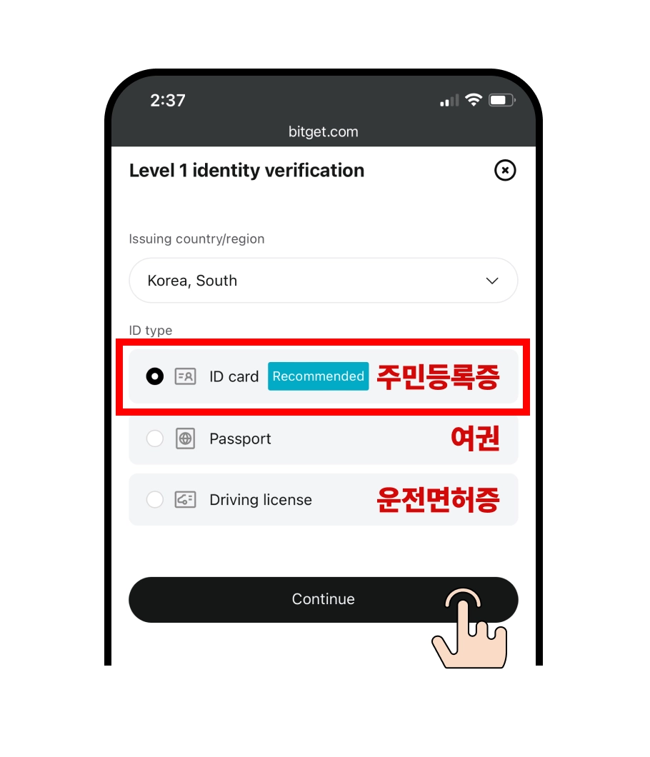 주민등록증, 여권, 운전면허증 중에 인증 방법을 선택해서 진행합니다.