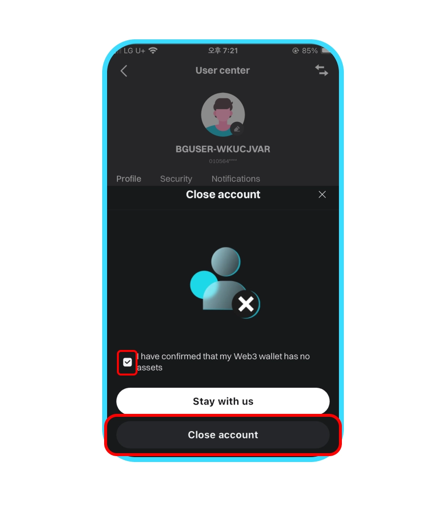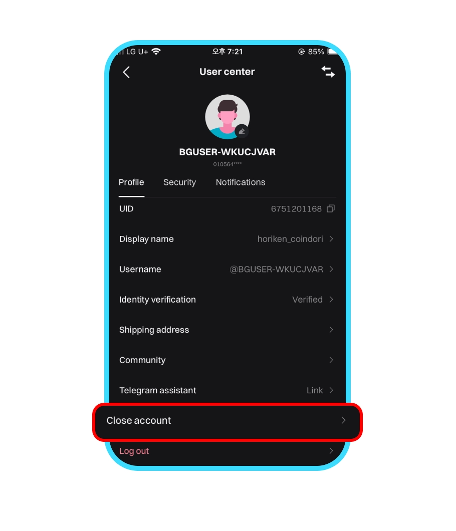 화면을 아래로 스크롤하여 「Close account」를 클릭합니다.