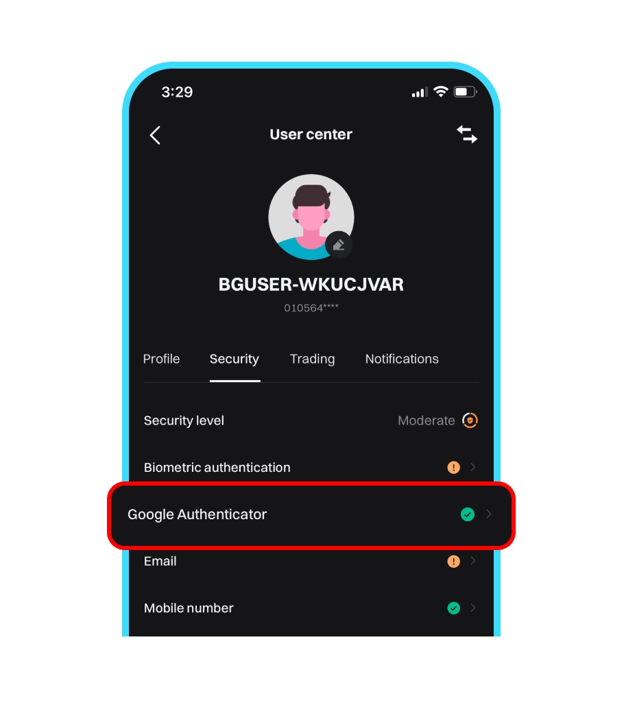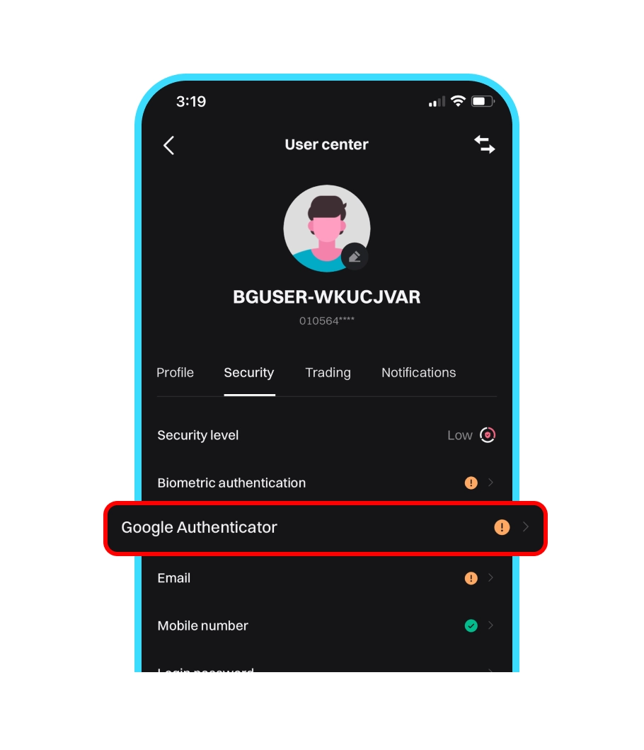 비트겟 앱에서 개인 정보 페이지로 이동합니다.