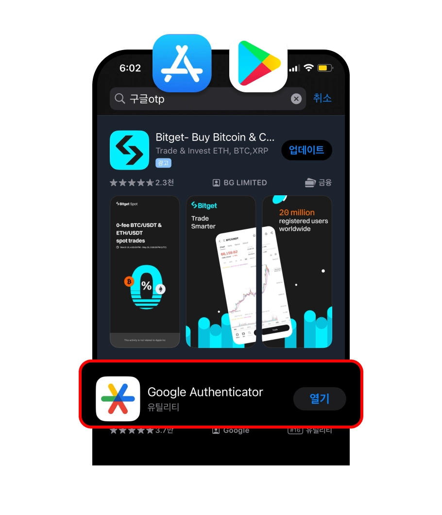 아이폰은 앱스토어, 안드로이드는 플레이스토어에 들어가서 구글OTP를 다운로드 받습니다.