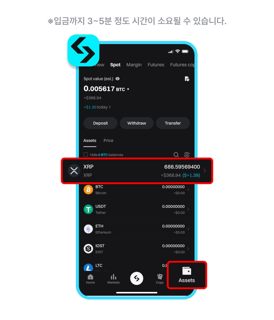입금이 완료되기 까지 3~5분 정도 시간일 걸리는 경우가 있습니다.