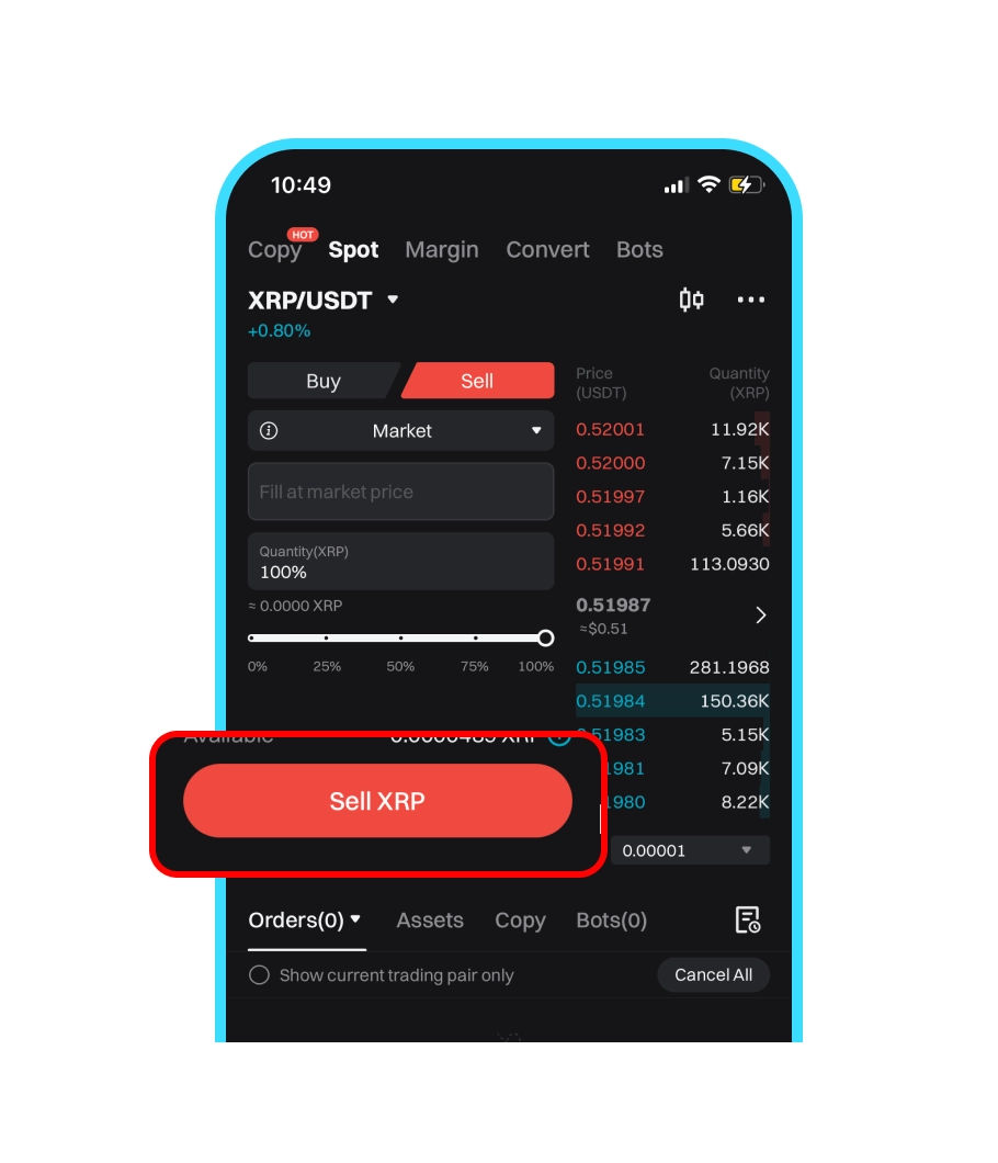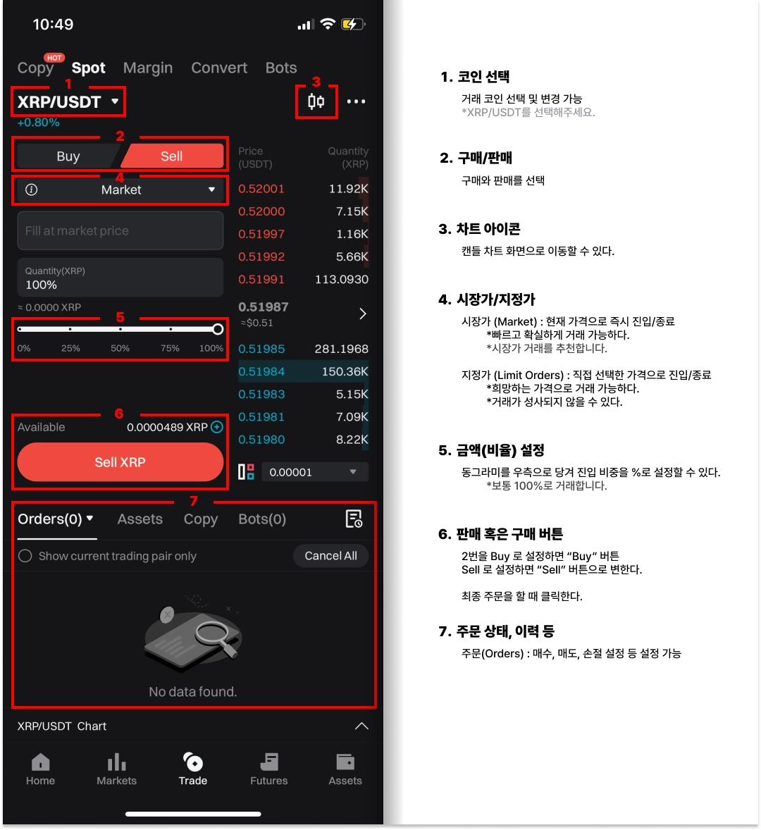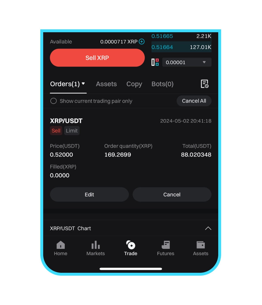판매가 체결되면, 리플(XRP)가 줄고 현금(USDT)이 늘어난 것을 확인할 수 있습니다.