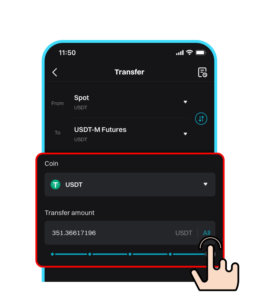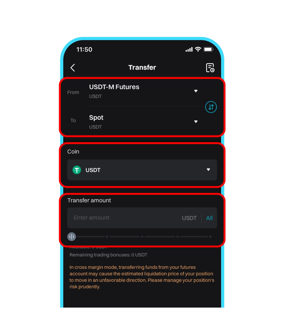 선물거래를 위해서는 선물 지갑으로 돈(USDT)을 옮겨야 합니다.