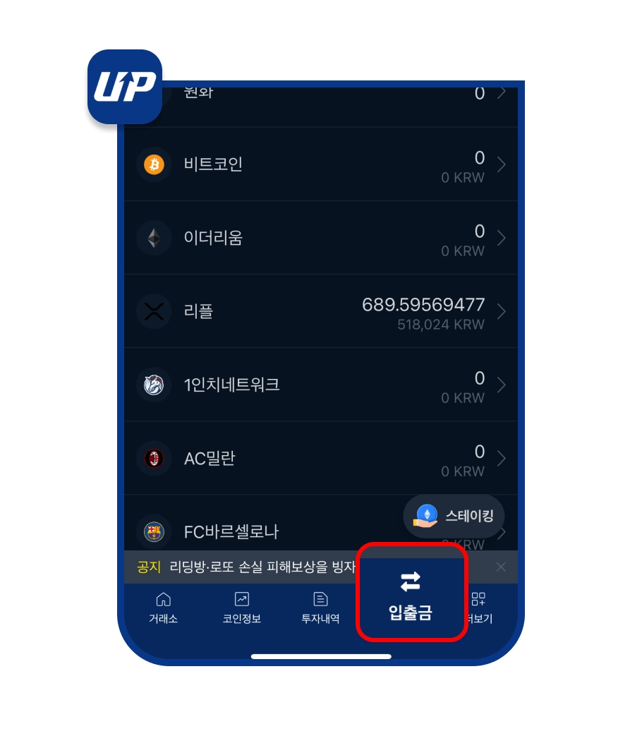 업비트에서 코인을 구매한 후, 입출금 페이지로 이동합니다.