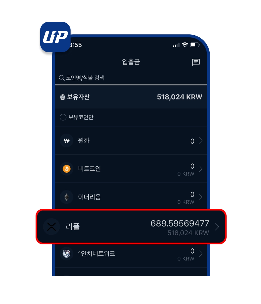 입출금 페이지에서 미리 구매해 둔 리플을 선택합니다.