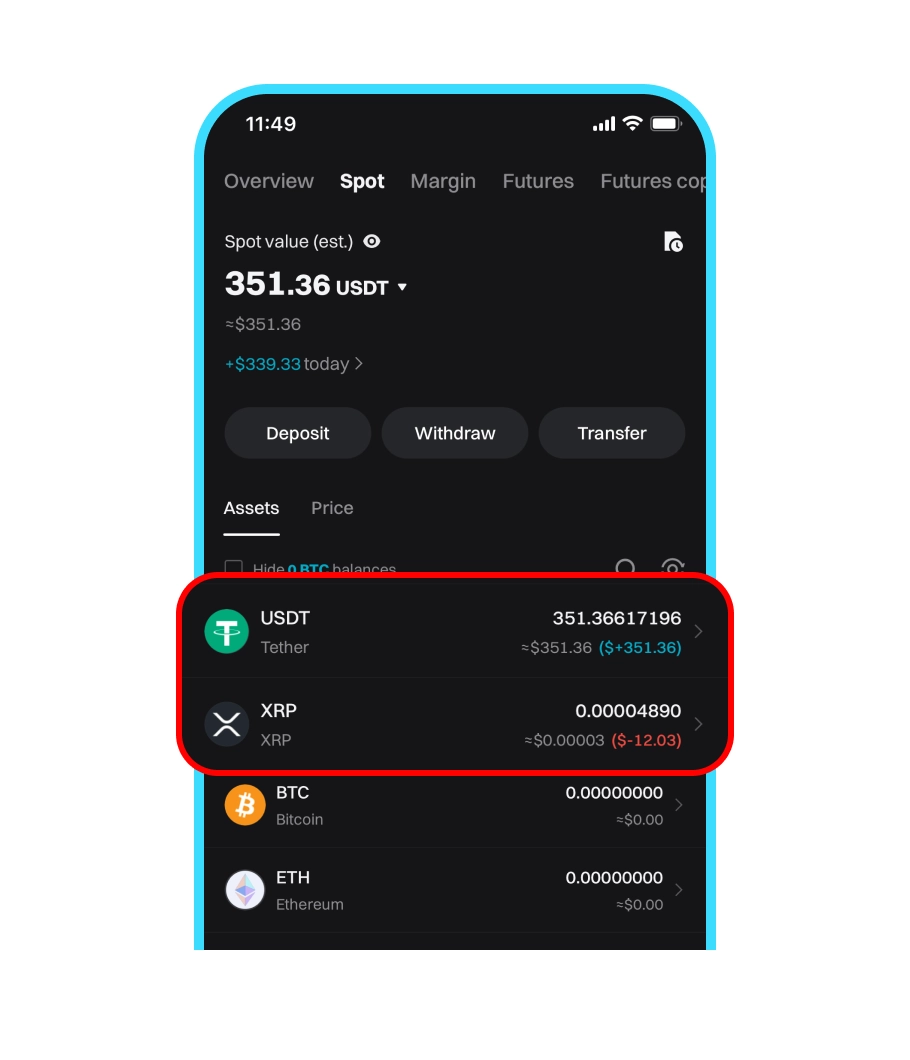 지갑(Assets)의 상단 메뉴에서 선물(Futures)로 이동하면, 현금(USDT)가 채워진 것을 확인 할 수 있습니다.