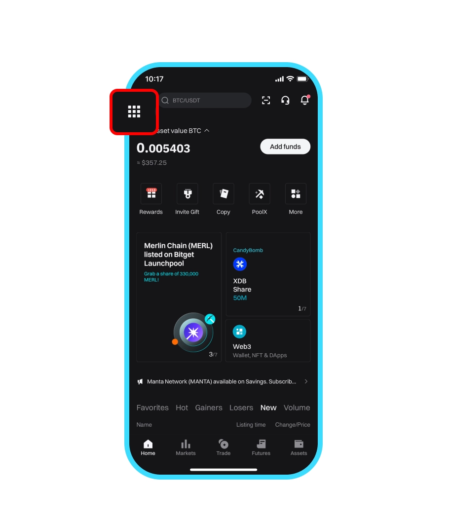 비트겟 앱의 왼쪽 상단의 메뉴 아이콘을 클릭합니다.