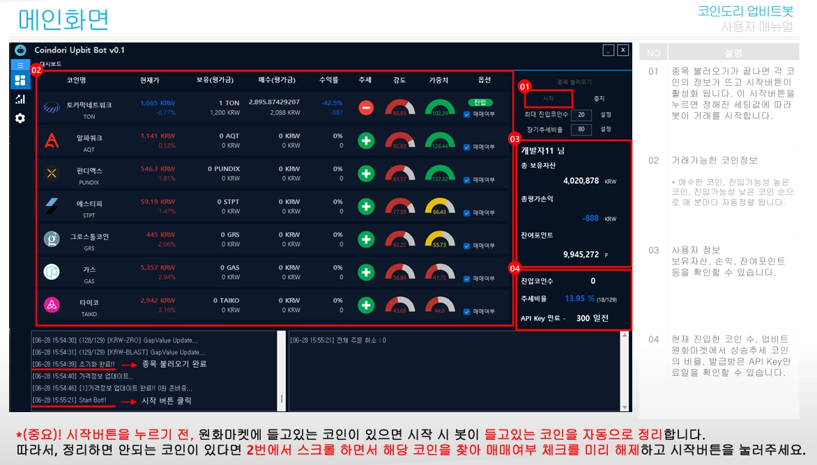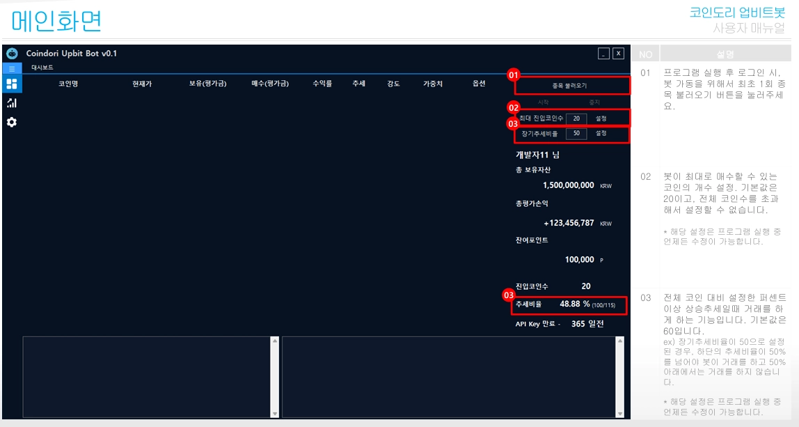 아래 코인도리 카페 링크를 업비트봇을 다운로드 하시면 전체 메뉴얼을 보실 수 있습니다.
